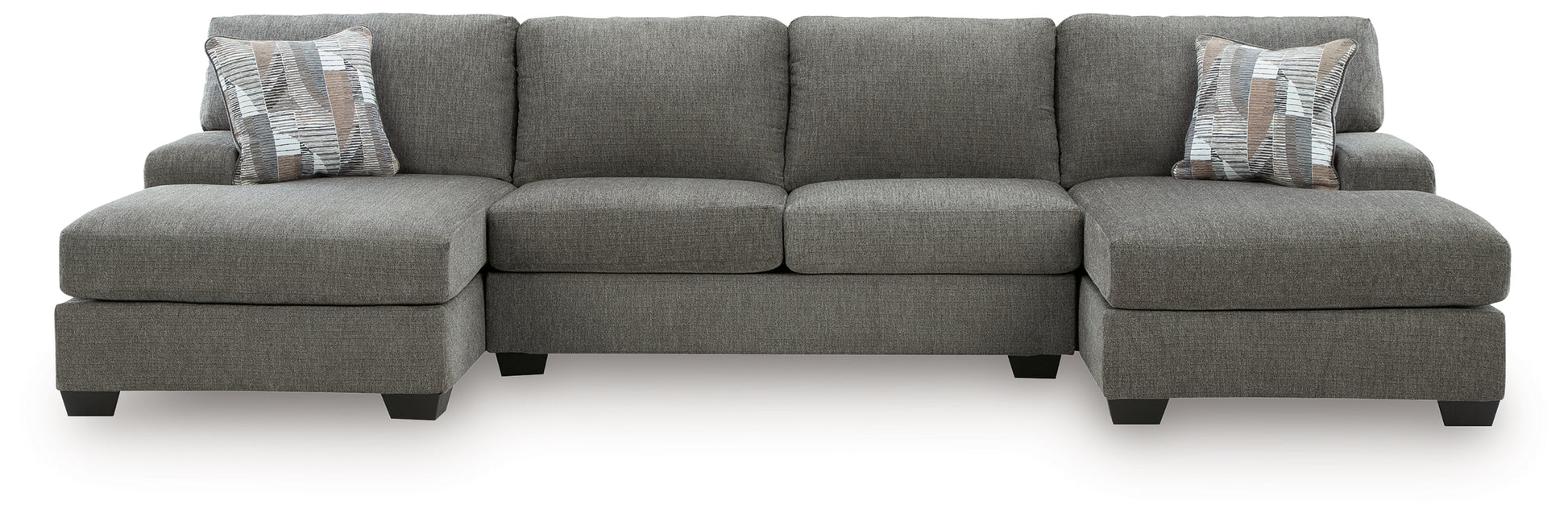 Why choose between classic comfort and modern design? This sectional with double chaise welcomes day-to-day relaxation in style. Its dimensional, menswear-inspired upholstery brings a designer touch to the easygoing silhouette. Gear up for game night or settle in to stream your favorite show—this sectional is an ideal supporting character for your living room hangs.