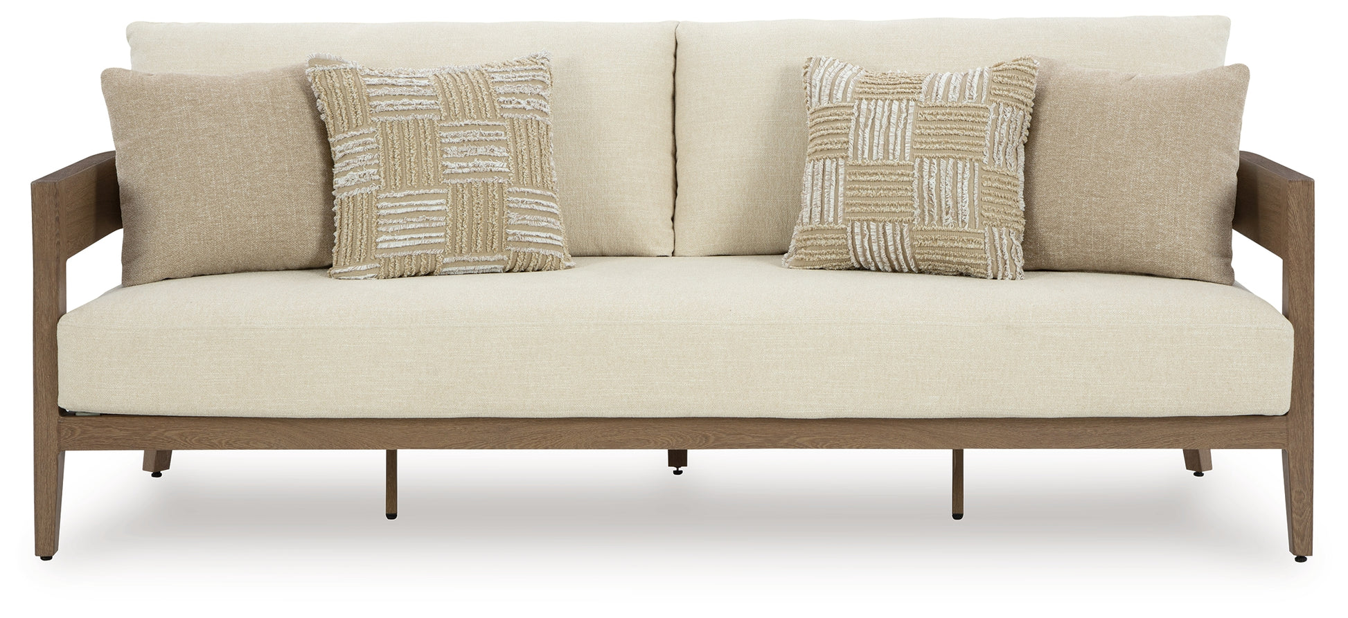 Elevate the appeal of easy-breezy living with this outdoor sofa. Made to look like wood yet durable enough to weather the elements, it's sure to serve you and your besties well, year after year. The gently curved piece features cushions wrapped in Nuvella+™ high-performance fabric for plush refinement. Patterned accent pillows infuse delightful texture.